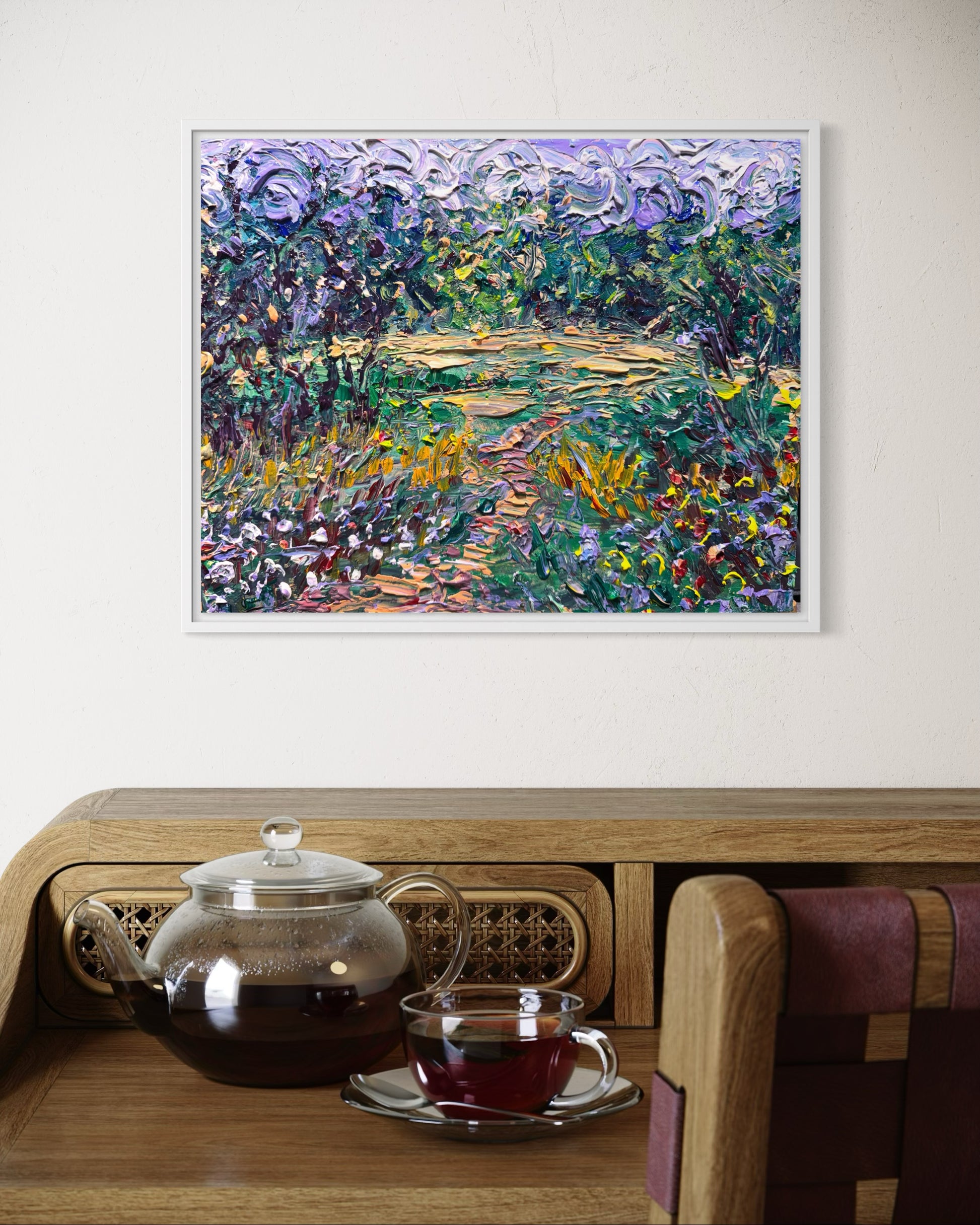 This impressionistic landscape depicts a field with a path leading back into the nature, purple swirling skies above. The original is acrylic on wood panel 11"x15" with thick impasto brush work.