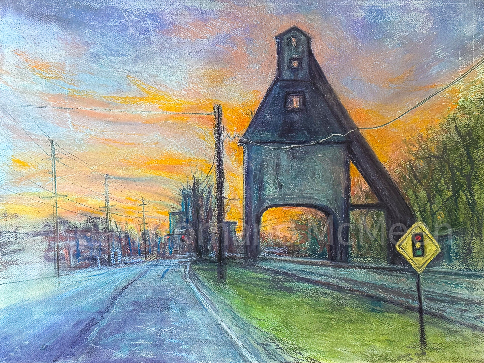 The historic coaling tower that used to stand in Michigan City, La Porte County, Indiana. The original is a soft pastel painting.