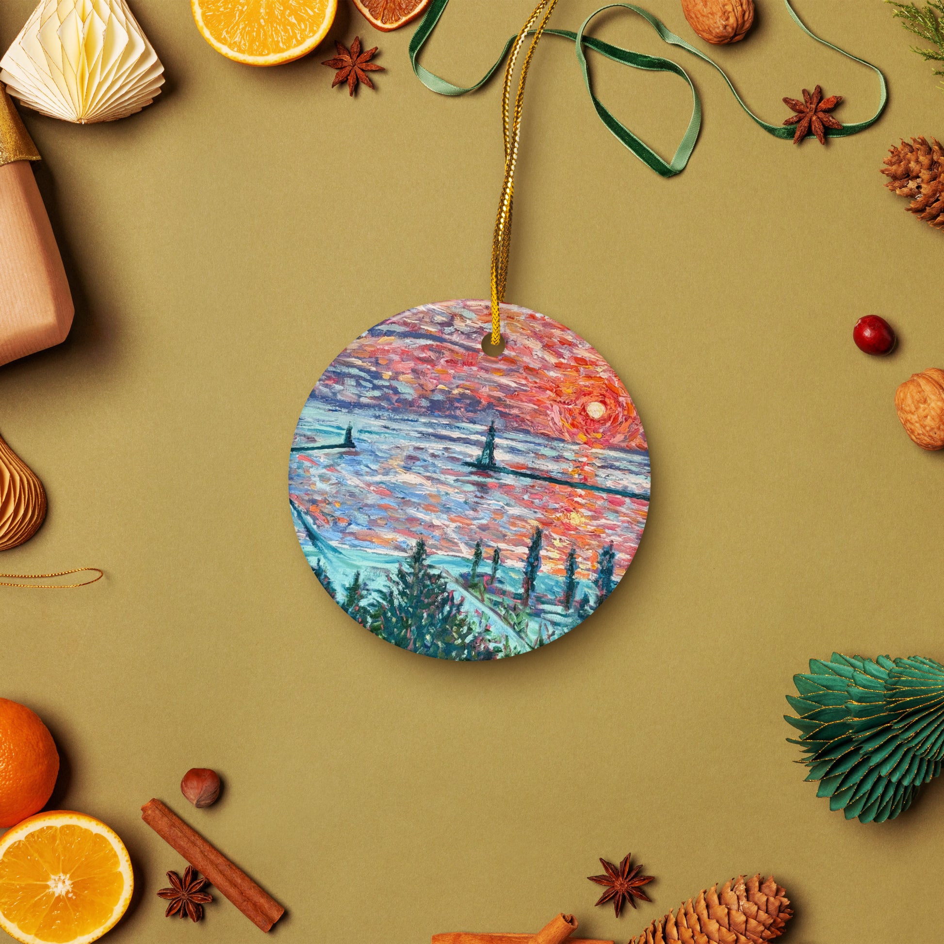 Bring charm to your home with a glossy ceramic ornament featuring Lake Michigan and a beautiful lighthouse. With a smooth finish and elegant gold-toned string, it stands out in any festive setting.