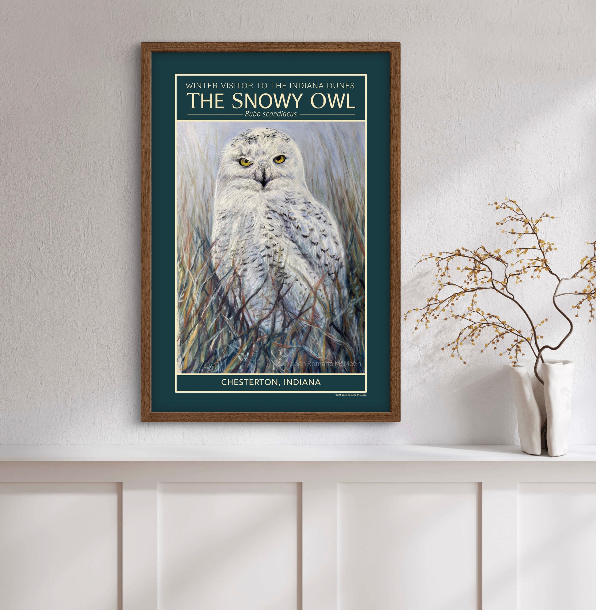 A snowy owl’s winter stay along the Indiana Dunes inspired this vintage-style poster, developed from an original soft pastel painting.