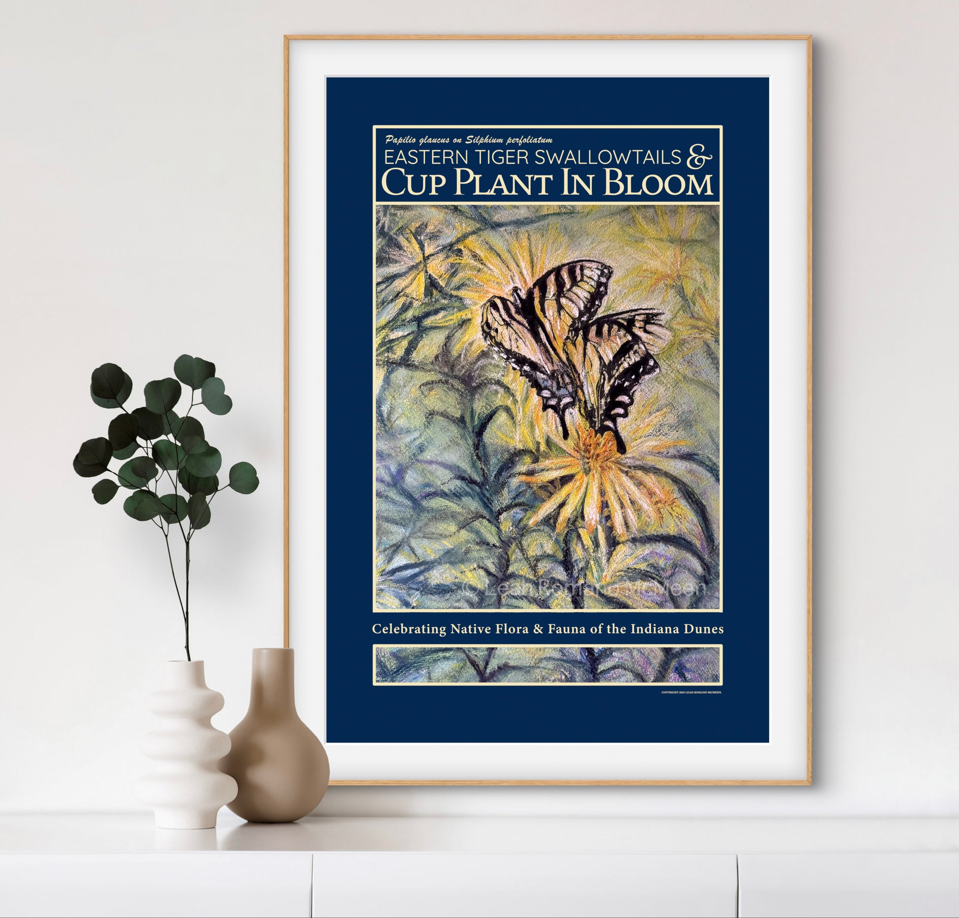 In the spirit of the historic WPA style posters, Swallowtails and Cup Plant in Bloom celebrates the native beauty of the Indiana Dunes region. This soft pastel depicts two Eastern Tiger Swallowtails (Papilio glaucus) drawn to the golden blooms of Cup Plant (Silphium perfoliatum), a towering native wildflower known for holding rainwater in its leaves. The piece captures the vitality and color of late-summer pollinator life, reflecting the harmony between native flora and fauna that defines the Dunes landscape.