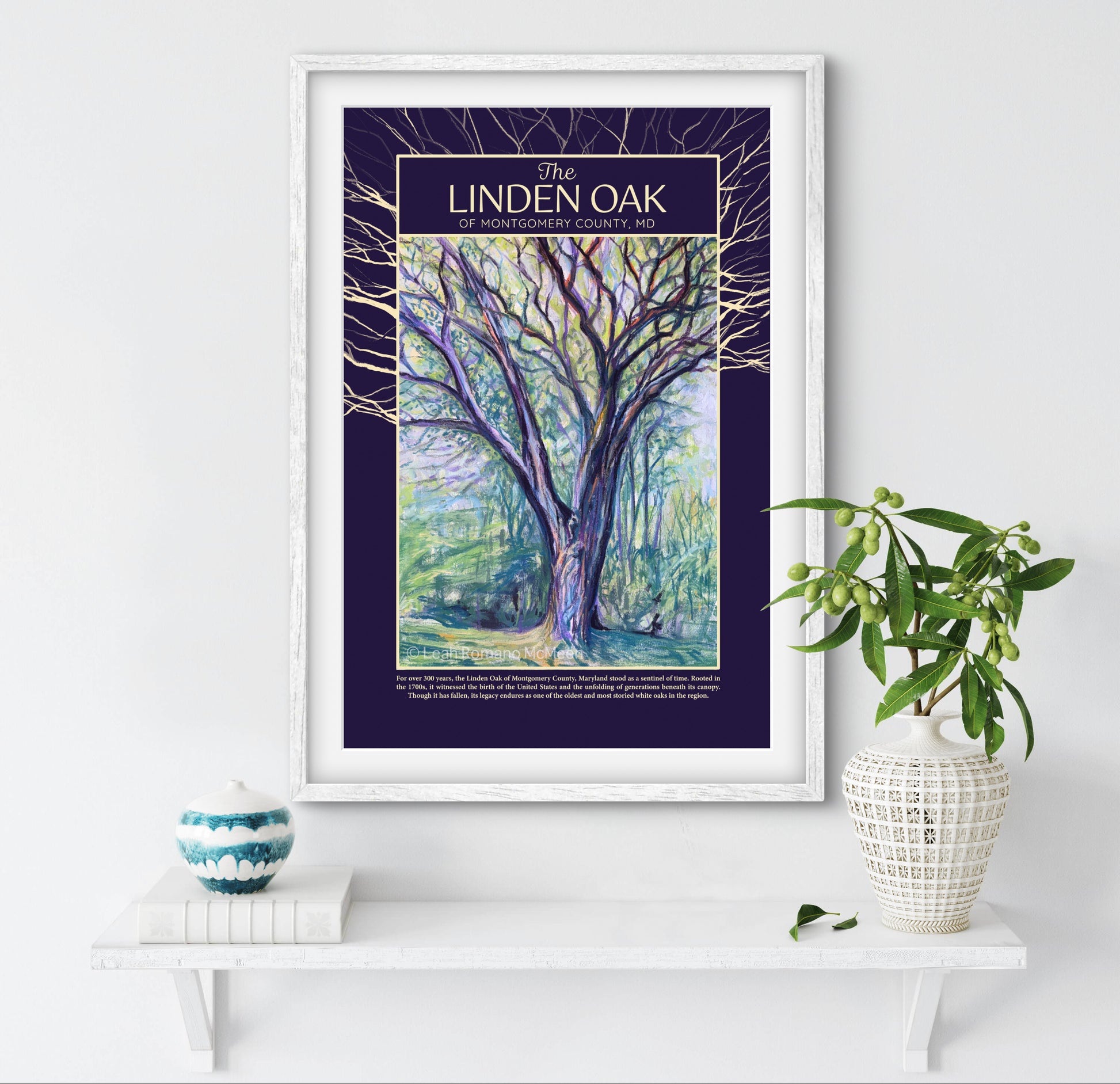 In the spirit of the vintage WPA travel posters, this art print features a soft pastel painting of a famous tree in Montgomery County, Maryland. For over 300 years, the Linden Oak of Montgomery County, Maryland stood as a sentinel of time. Rooted in the 1700s, it witnessed the birth of the United States and the unfolding of generations beneath its canopy. The tree eventually died and was taken down in 2023. Though it has fallen, its legacy endures as one of the oldest and most storied white oaks in the region.