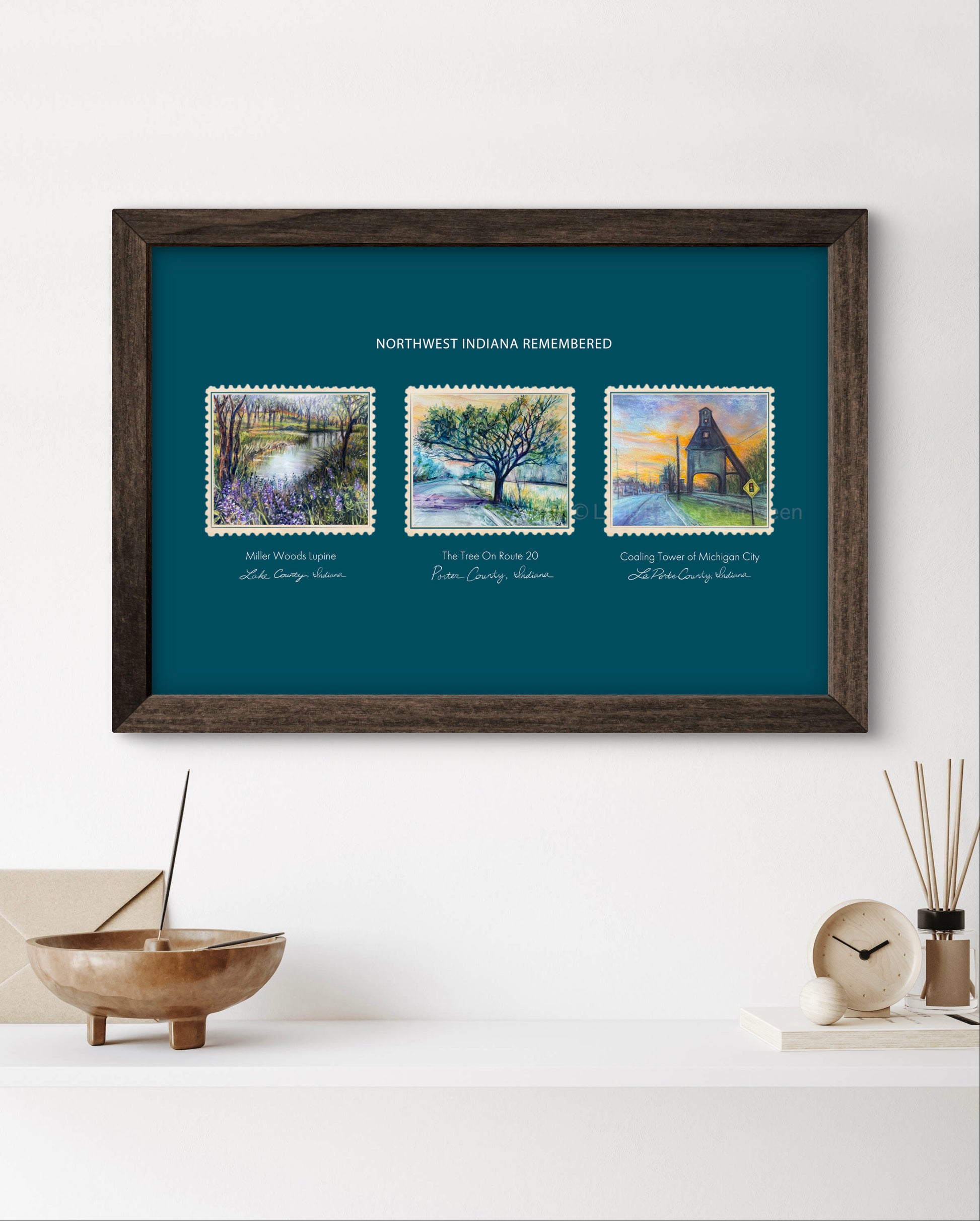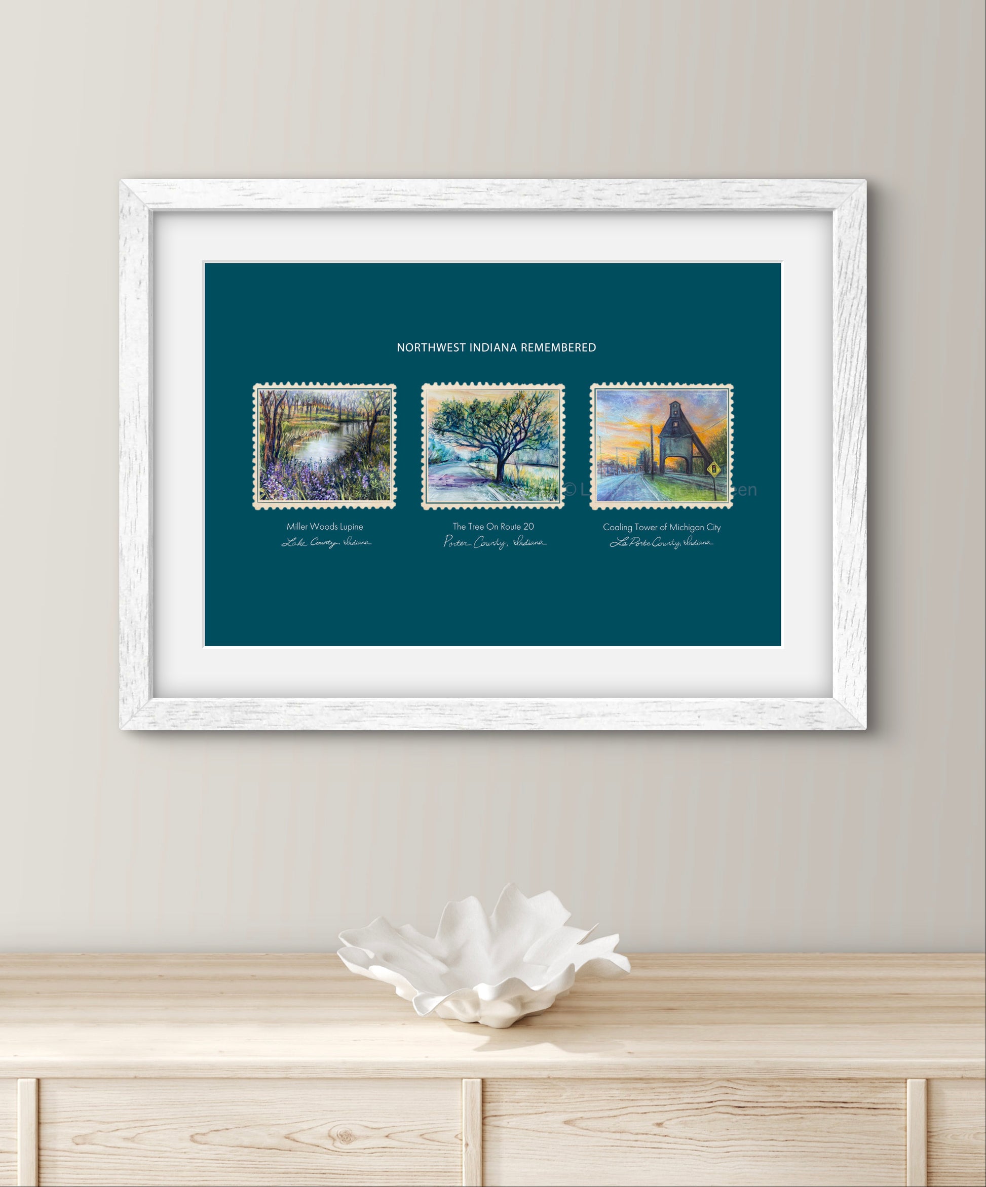 This triptych features three special scenes from Northwest Indiana, all original artwork in watercolor and soft pastel. This includes one painting of a scene from LaPorte County, Porter County, and Lake County.