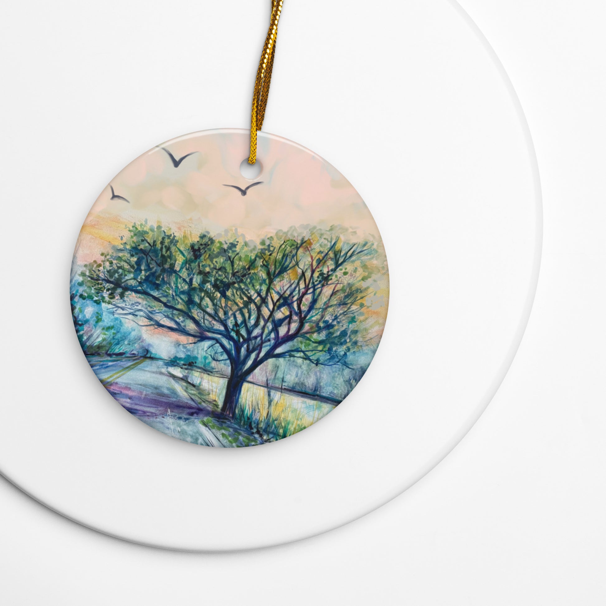 Bring charm to your home with a glossy ceramic ornament memorializing the beloved Tree On Route 20 in Furnessville, Indiana. With a smooth finish and elegant gold-toned string, it stands out in any festive setting.